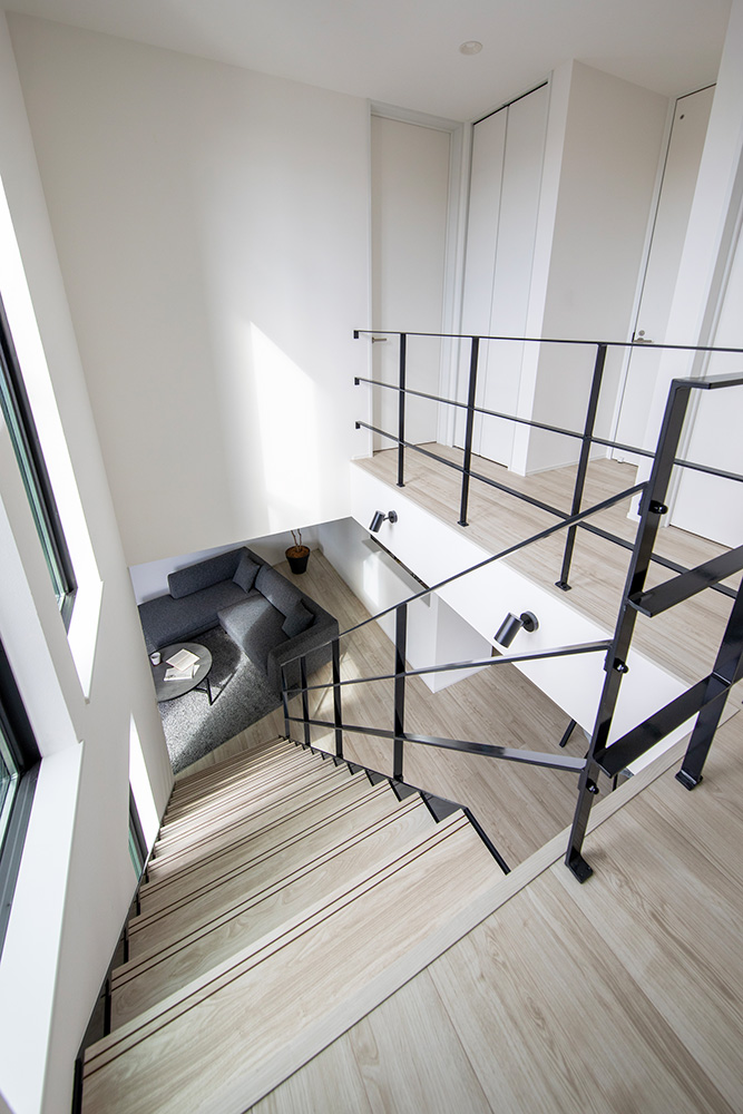 リビング階段を中心にL字型に広がるLDKは、空間を緩やかに繋げ開放感と一体感を生み出しています。