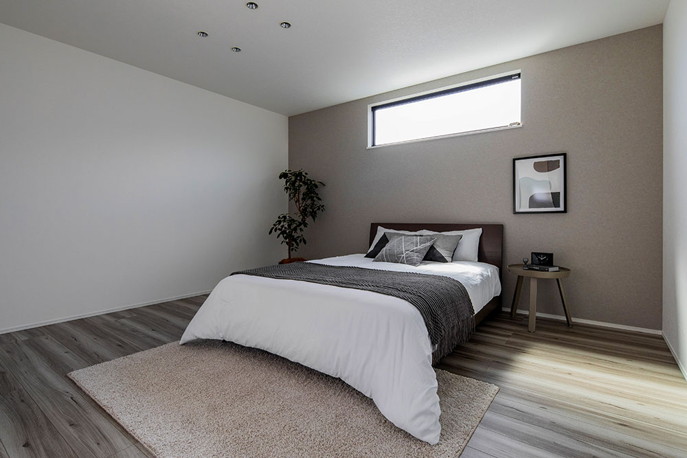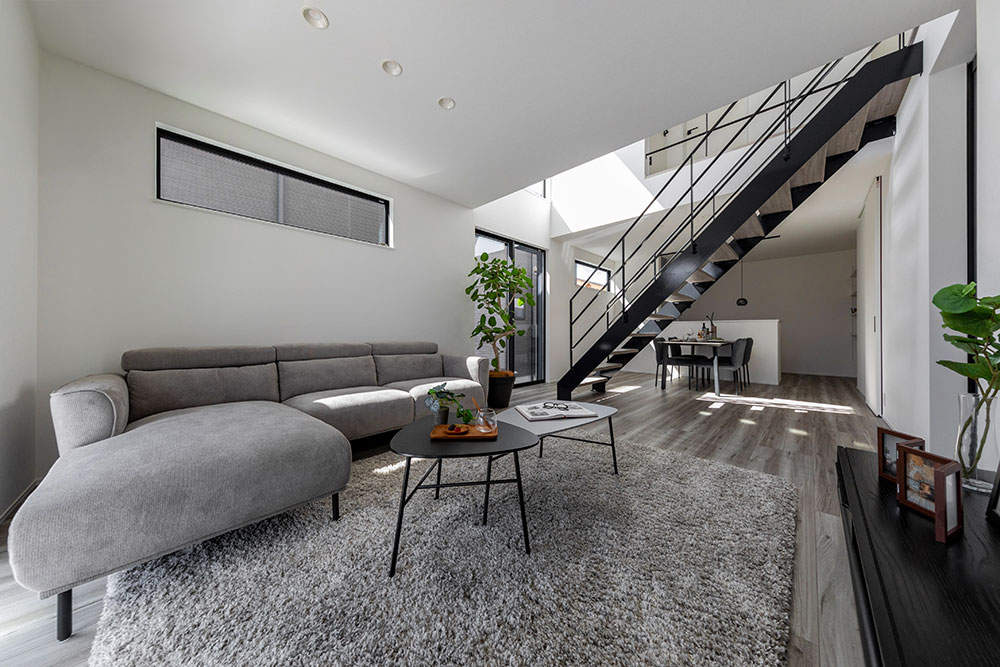 真っ直ぐに視線が抜ける開放的な直線型のLDK。 リビングには吹抜けを設け、穏やかな光が降り注ぐ心安らぐ空間に仕上げました。 暮らすほどに心地よさが深まる、家族の笑顔が集う邸宅です。