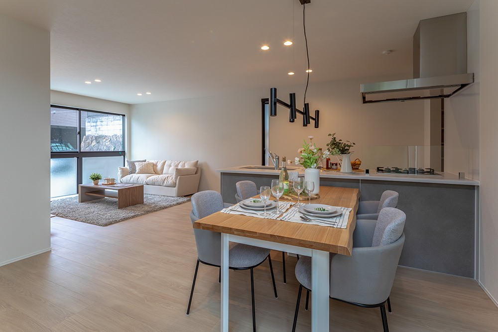 個性的な造作収納がアクセントとなった、明るく開放的なLDK。 1階にウッドデッキを設け、アウトドア気分を満喫できるリビングです。 日常の喧騒から離れ、家族が心安らぐ時間を紡げる住まいが完成しました。