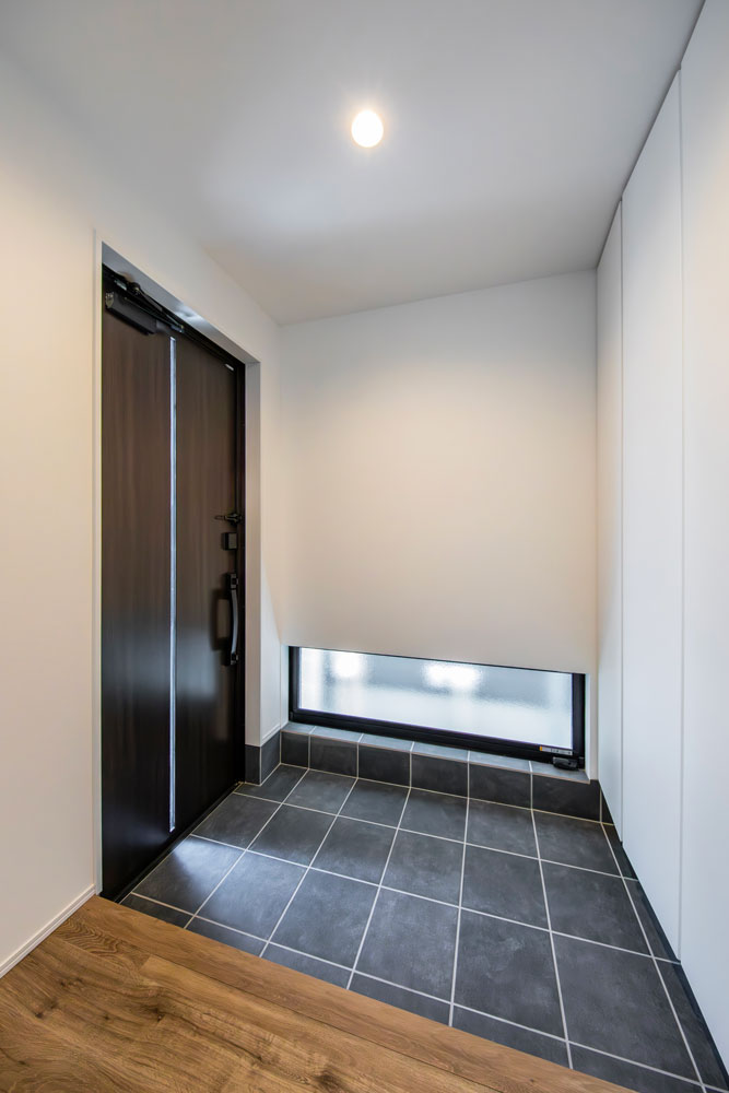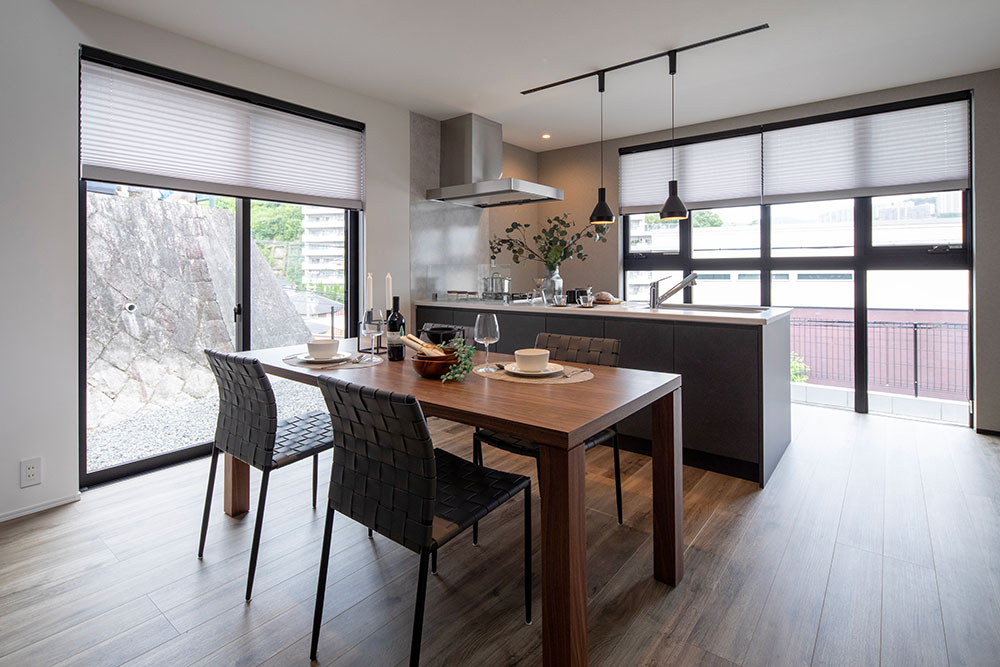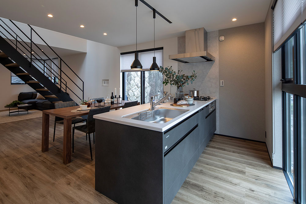 グレージュの床材と黒を基調としたインテリアがシックな場を演出する住まい。 効果的な窓配置を施し、日常に開放感をもたらしてくれます。 日常に穏やかな時が流れていく、家族だけのプライベートな空間をご用意しました。