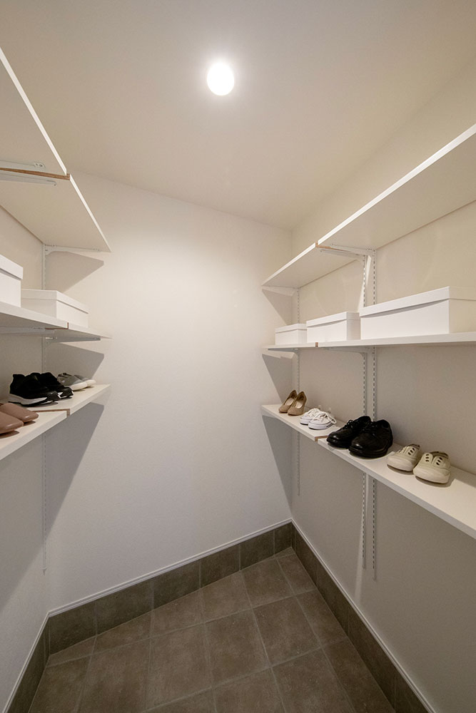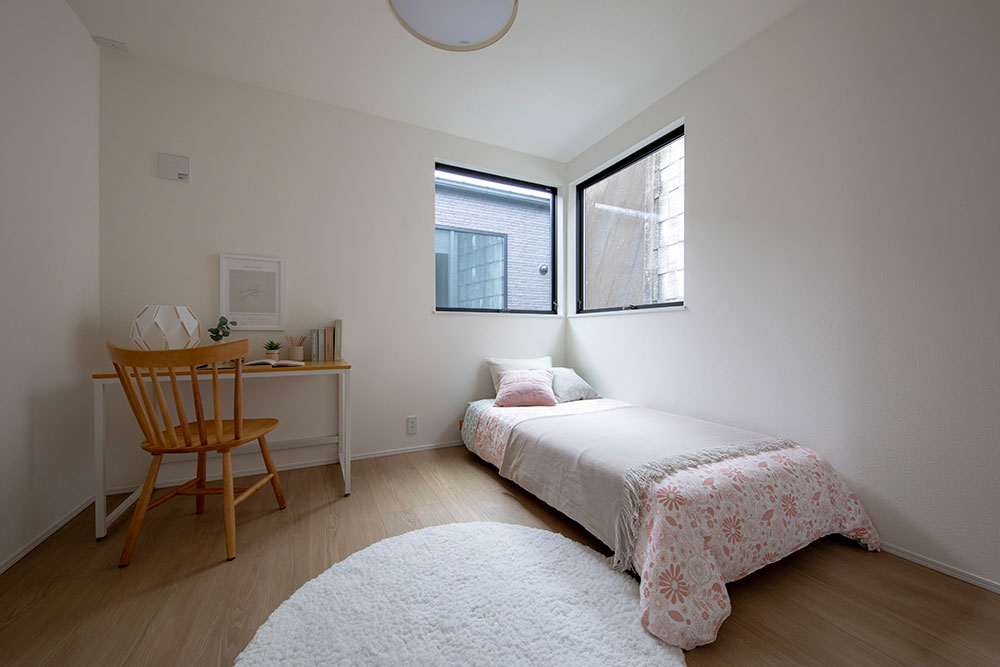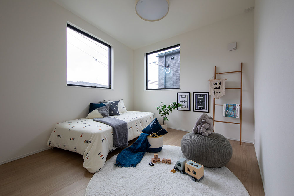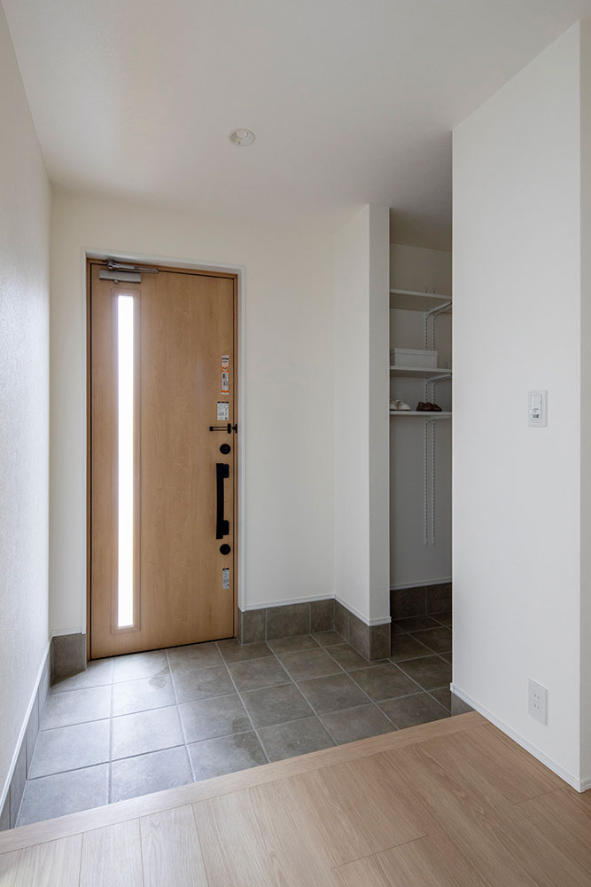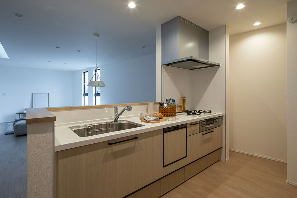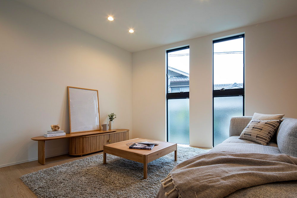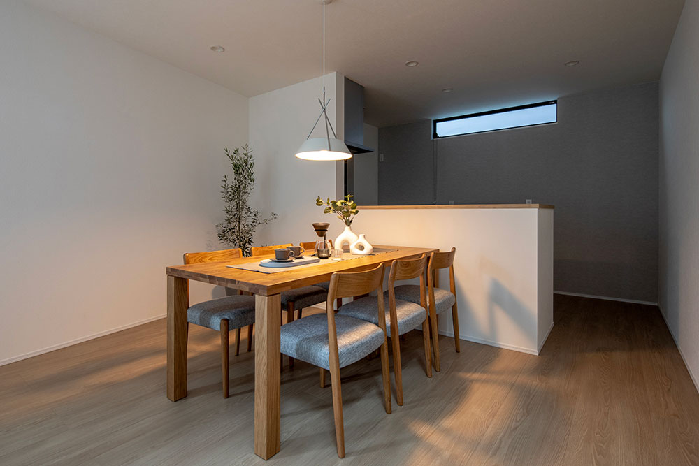 床材や家具に取り入れたナチュラルカラーが、空間にやわらかな温もりをもたらす住まい。 約22.2帖のLDKには、スリット窓と吹抜け階段から陽光が降り注ぎ、家族を優しく包み込みます。 光に満たされた中で、家族が自然と集い、心地よい時間を分かち合える邸宅です。