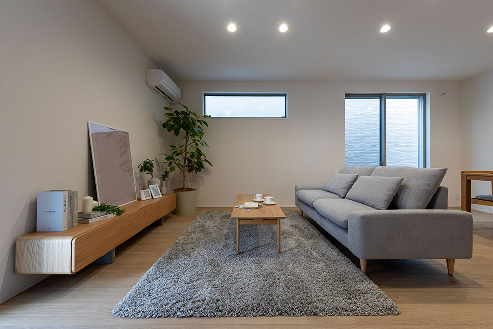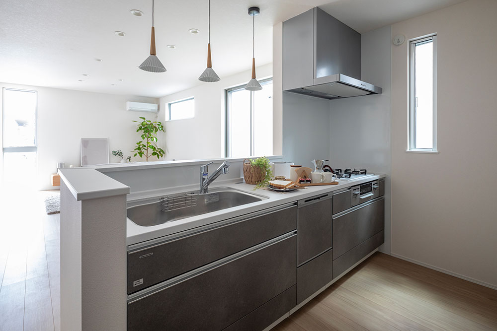 一直線に伸びるLDKは、部屋全体を見渡せる開放的なプランニング。 随所に取り入れたグレーカラーと木の風合いを生かした床材が、落ち着きある雰囲気を演出します。 淡いトーンで整えられた空間が、日常を心地よく包み込む住まいに仕上がりました。