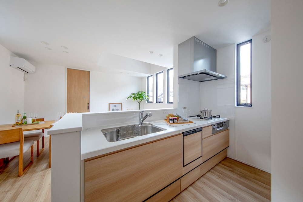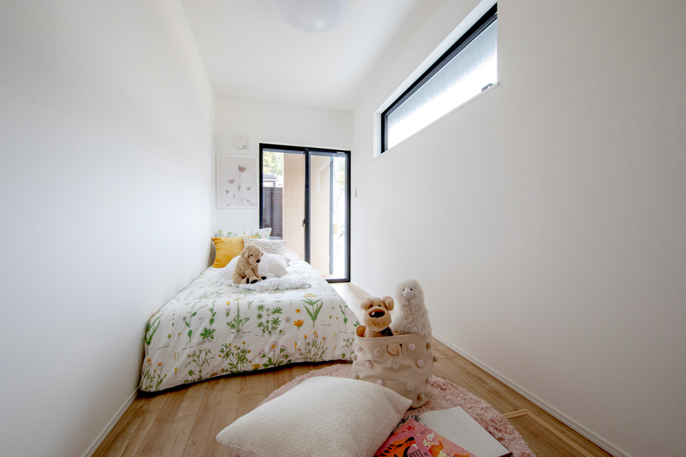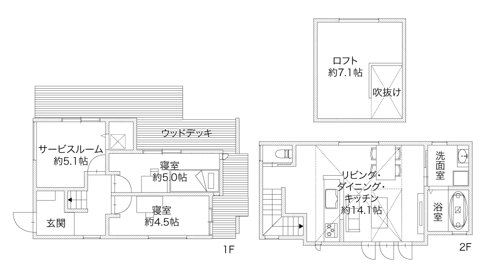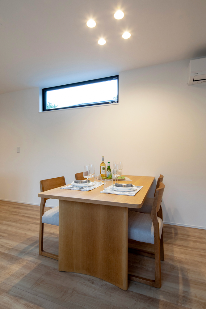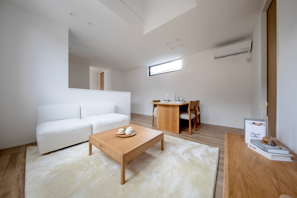 リビングに便利なロフトを設け、スペースを余すことなく活用した空間設計。 ウッドデッキは各部屋をつなぐことで、家族の交流がより盛んになります。 利便性とつながりを大切にした、家族想いな住まいです。