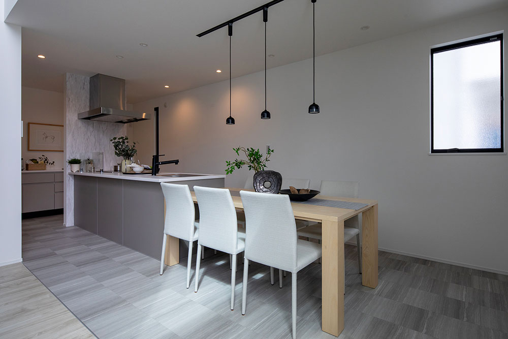ホワイトをベースに黒を効かせた洗練された空間で、開放感と落ち着きが共存する23.1帖のLDK。