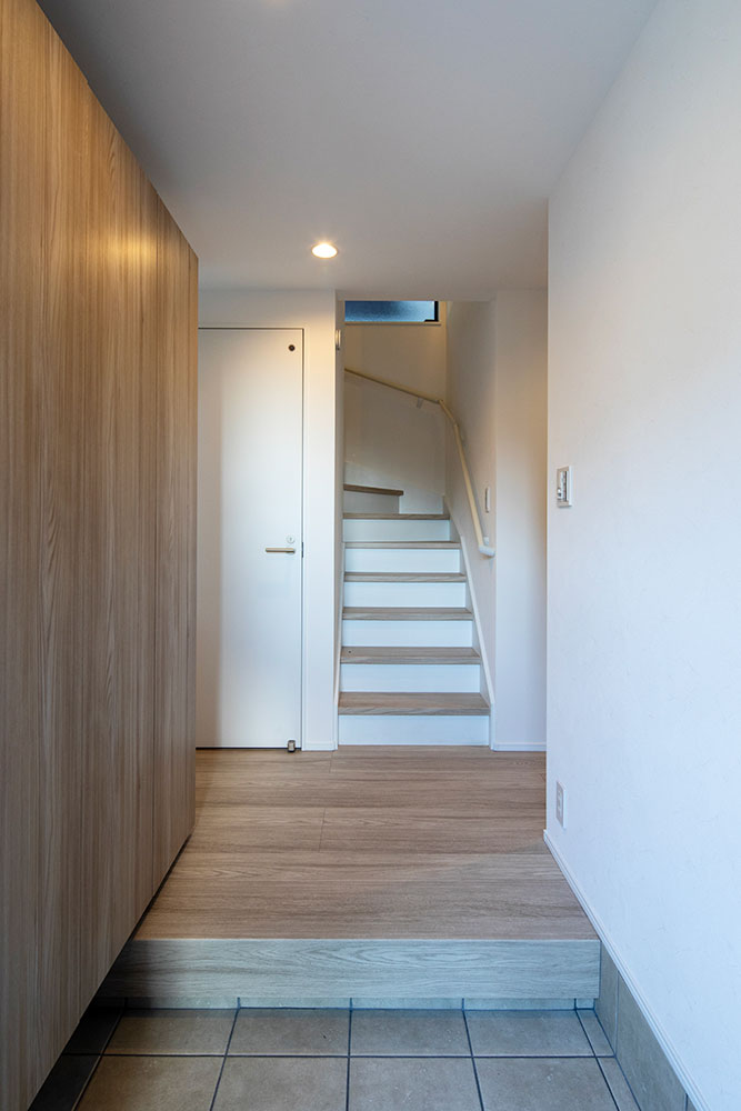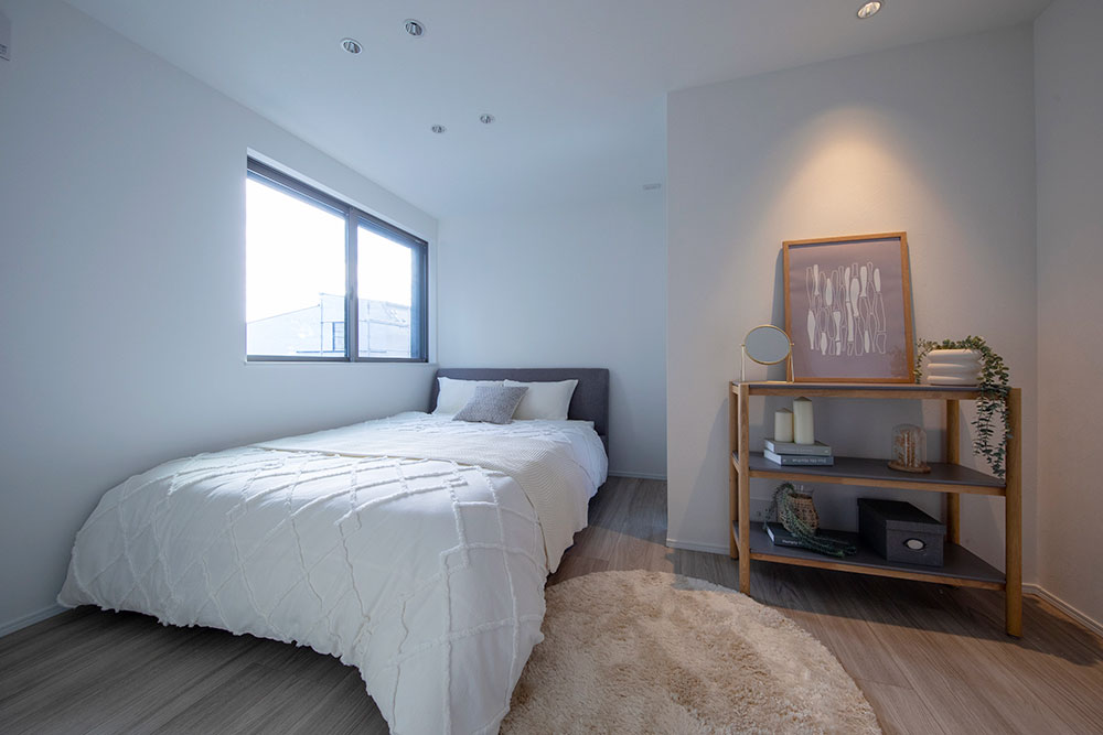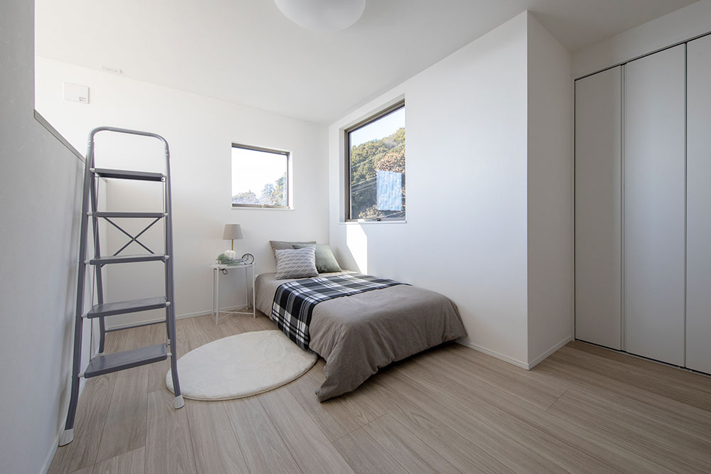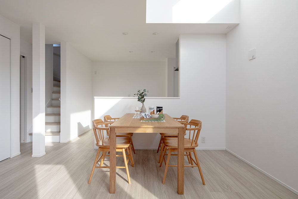 直線型LDKの一角を高天井にすることで、光に満ちた開放的なLDKを実現。 朝の光が心地良く差し込む寝室には、多用途に愉しめる隠れ家的なロフトを設計しました。 陽光と開放感に包まれる、憩いの住まいです。