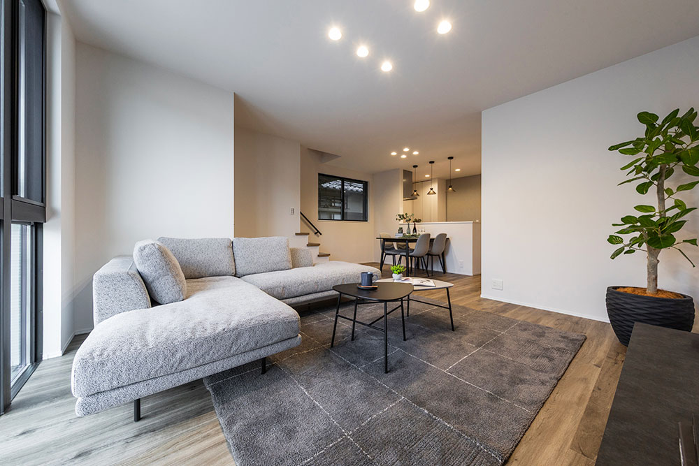 道路より高い位置に配し、外からの視線を遮ることで、上質なプライベート感を確保した住まい。 落ち着いた色合いで統一したLDKは、家族がゆったりとくつろげる心地よい空間に仕上げました。 寝室には隠れ家のような遊び心が感じられるロフトを設け、家族それぞれが愉しめる邸宅です。