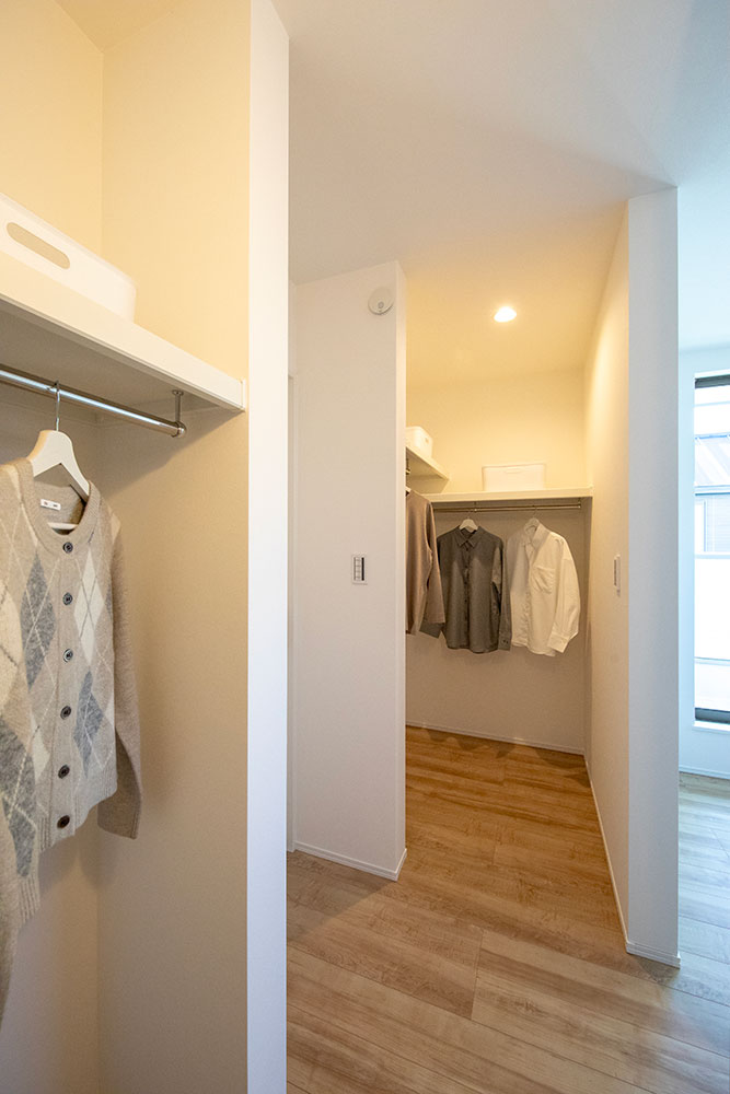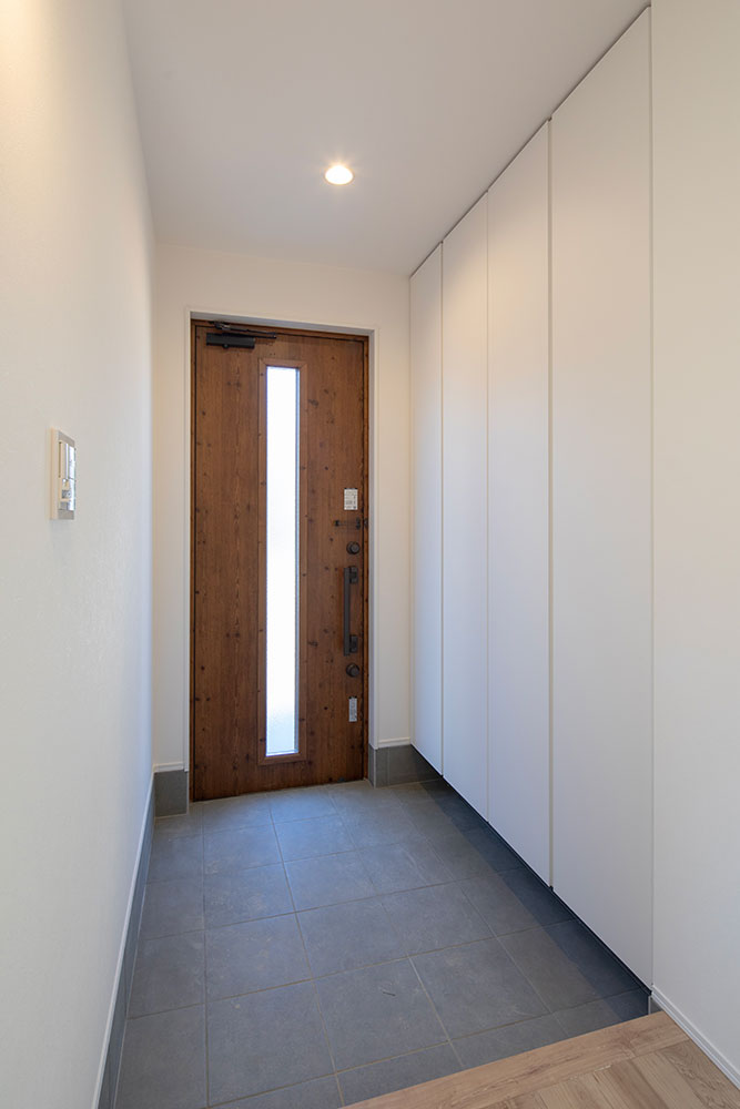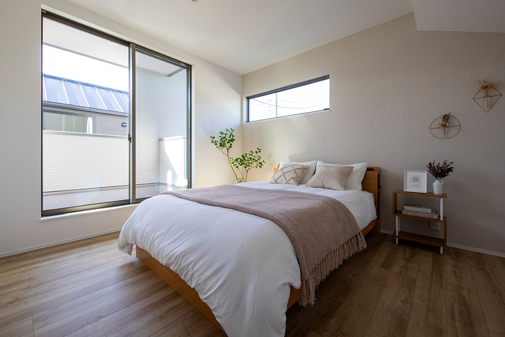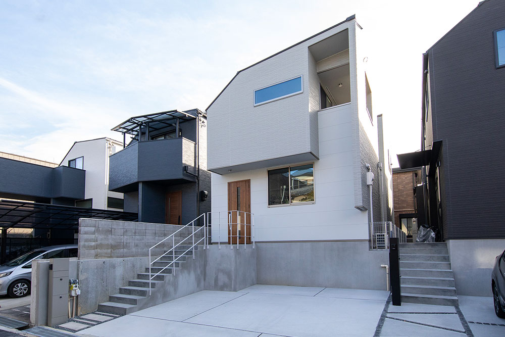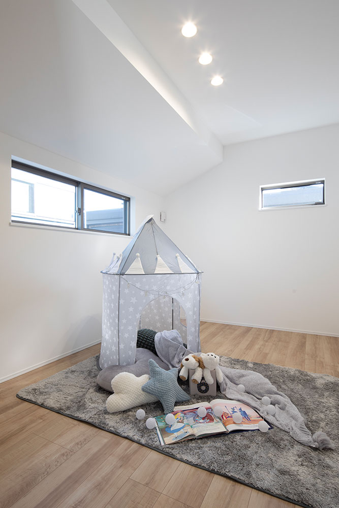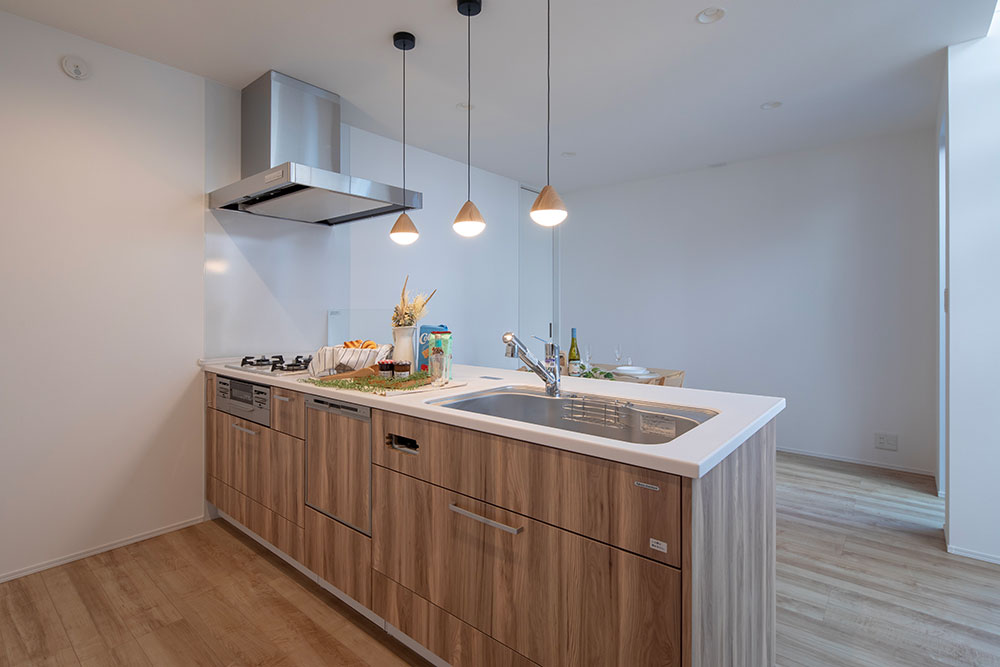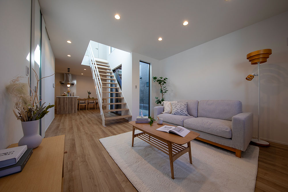 緩やかに空間を区切ることで生活シーンにメリハリを与える、「コの字型」を採用したLDK。 中央に設けたリビング階段は、上下階をつなぐだけでなく、家族との会話が自然と交差する場所に。 インテリアはナチュラルなもので統一し、穏やかなぬくもりに満ちた邸宅となりました。