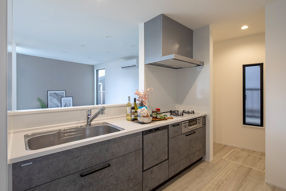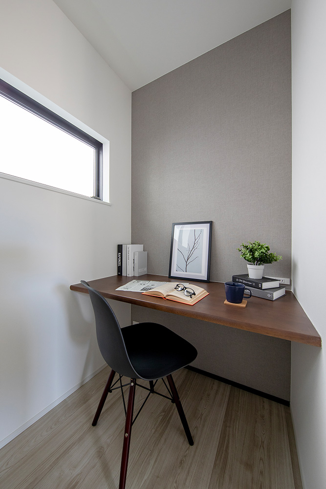 インテリアからアクセントクロスまでグレートーンで統一することで、落ち着きのある佇まいに。