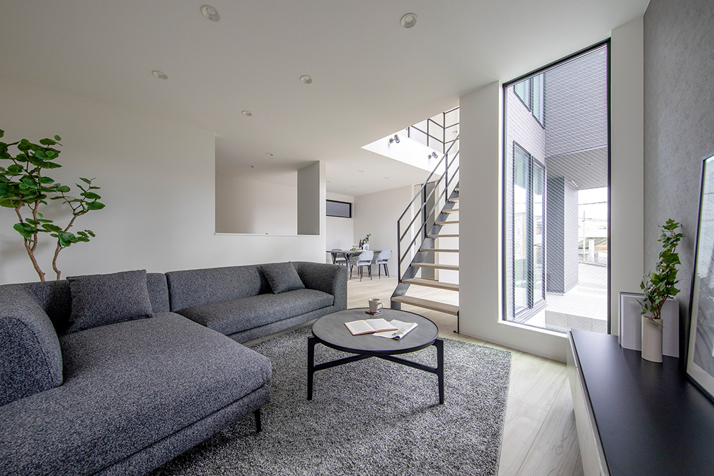 リビング階段を中心にL字型に広がるLDKは、空間を緩やかに繋げ開放感と一体感を生み出しています。