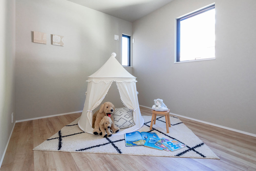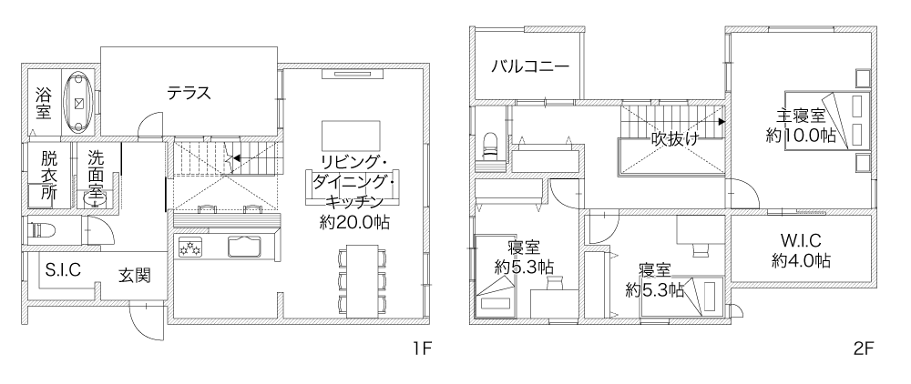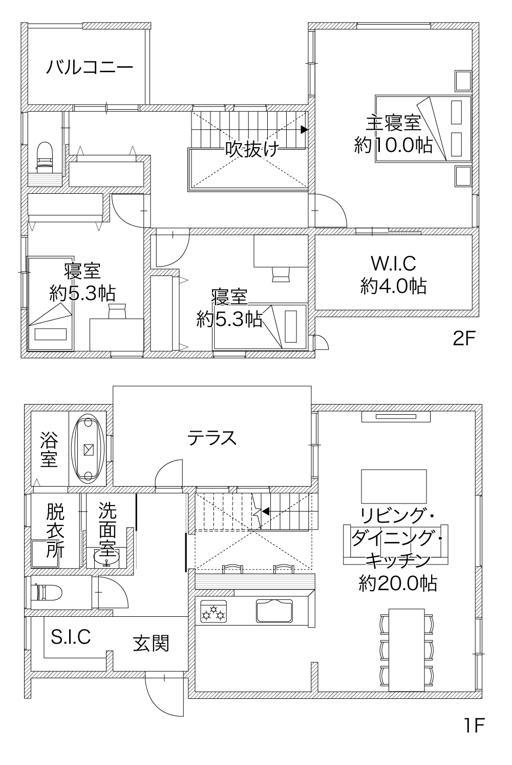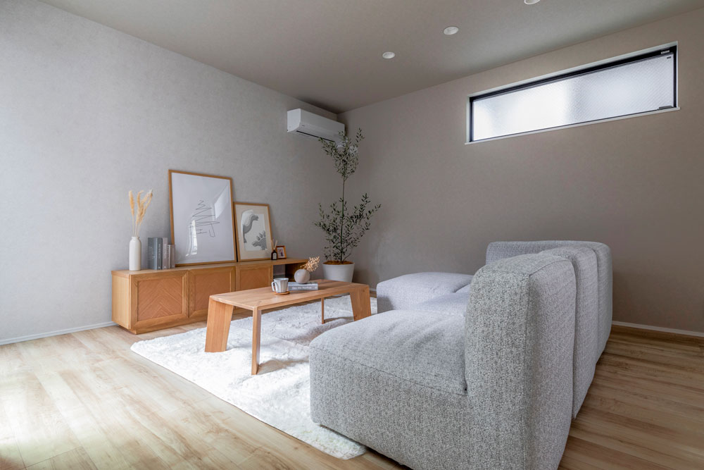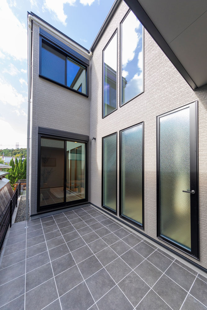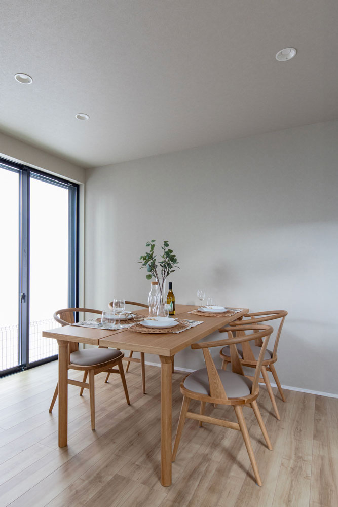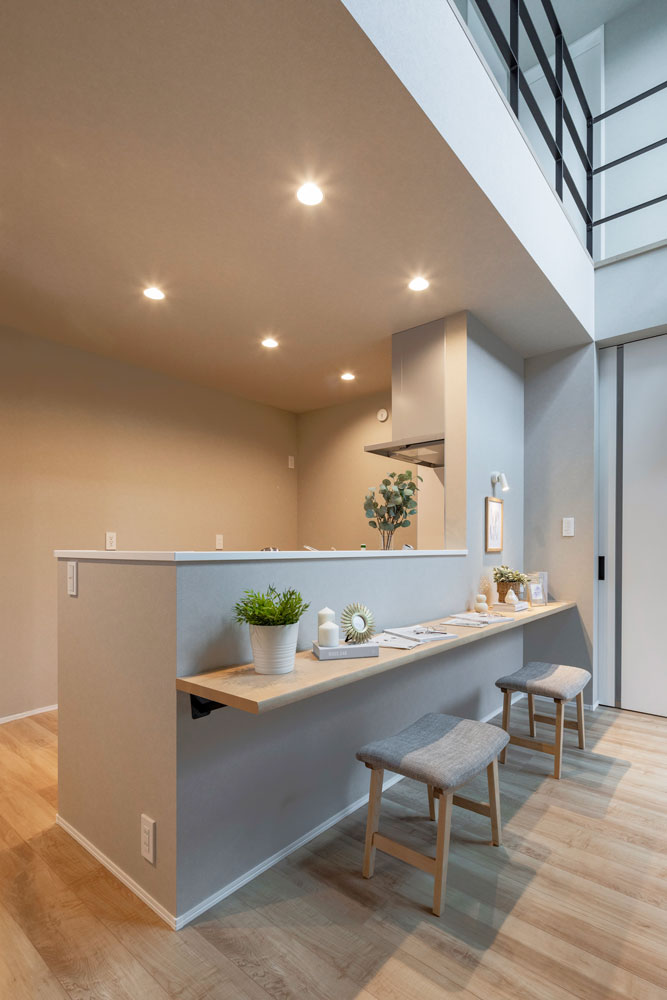 吹抜けから温かな陽光が差し込む、開放的なメイン空間。 ゆとりのあるテラスはアウトドアリビングとして暮らしの幅が広げてくれます。 落ち着きのあるトーンで整えられた空間で心地よい時間を過ごせる住まいです。