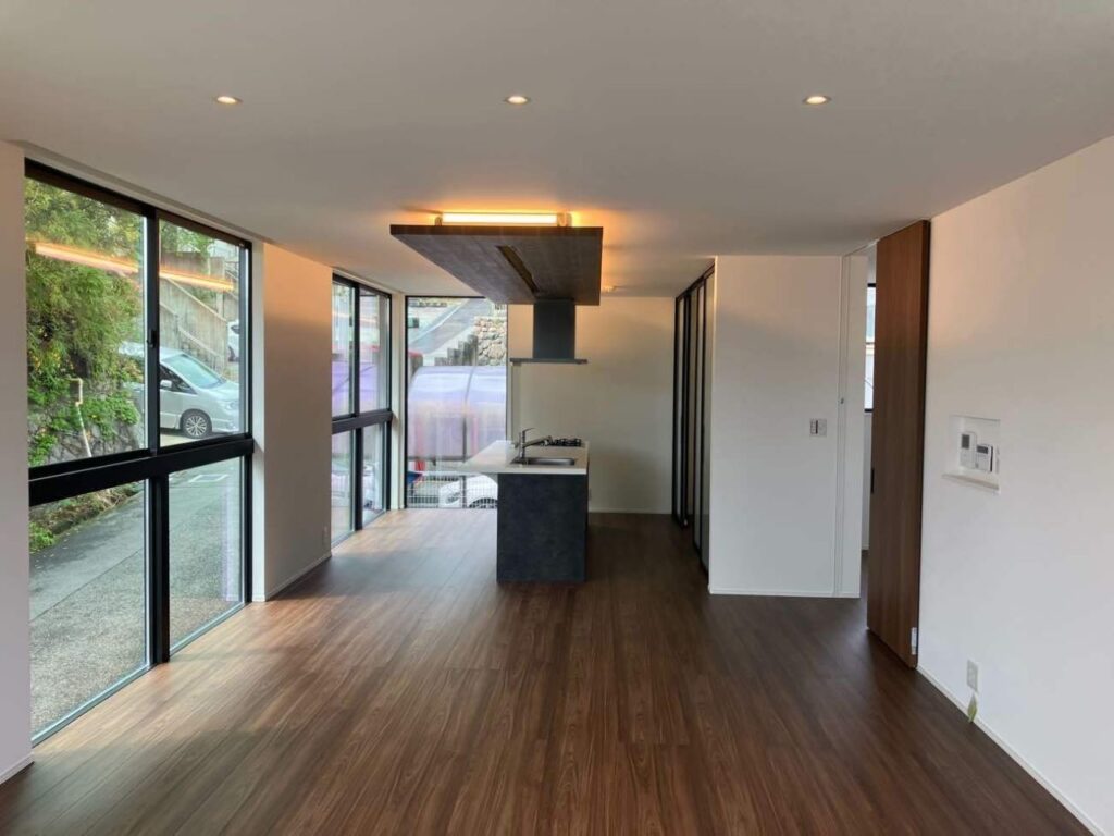 窓が大きく道路から見え過ぎてしまう物件だったため、上下式のプリーツスクリーンを提案させて頂きました。解放感を持たせたまま、視線を遮りつつ周辺の緑を望めるようにしました。室内ではグリーンや木目調の家具を積極的に採用し、内と外で自然を感じられるように工夫をしました。
