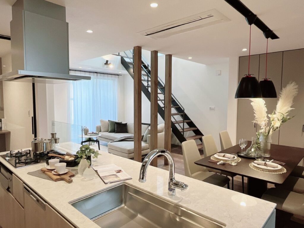 高価格な建売住宅だったため、ラグジュアリーな雰囲気になるように依頼を受けました。ブラックのアイテムで空間を引き締め、ゴールドの小物やボリュームのあるフェイクグリーンで華やかさを演出しました。