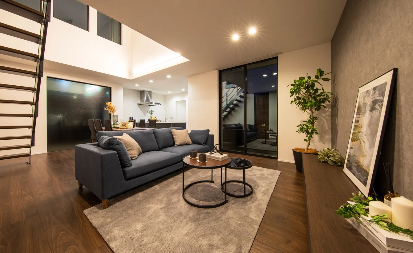 開放的な吹抜けリビングは家族だけの時間を過ごせるよう、プライベート感のある設計に。