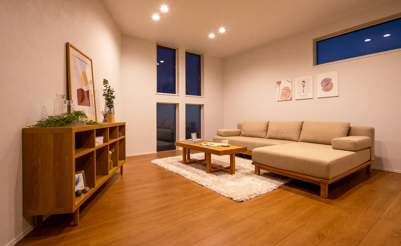 団欒を育むリビング。採光性とデザイン性を両立した窓配置によって空間に柔らかな光が注ぎ込む。