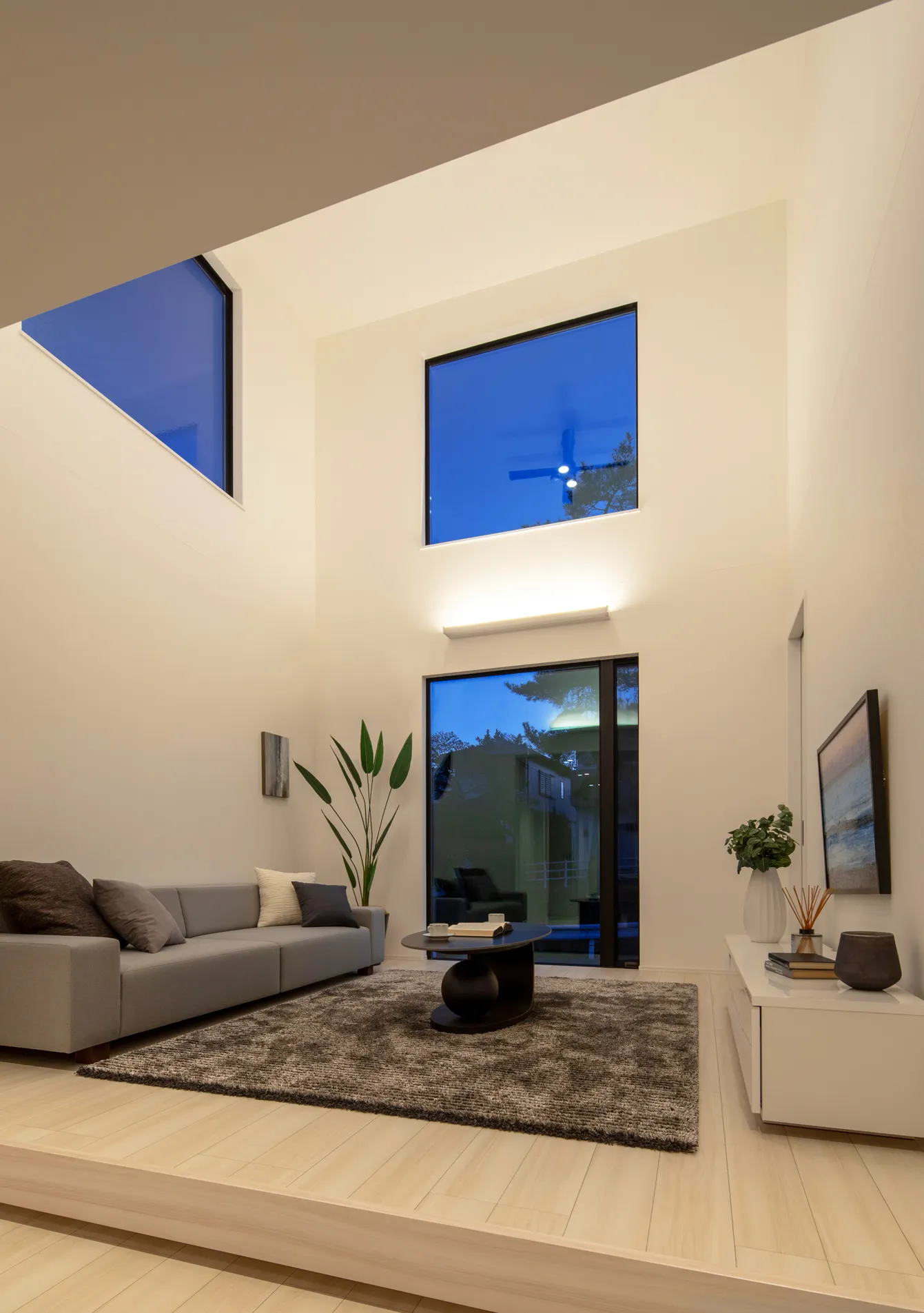 縦の広がりが開放感を演出するリビング空間。吹抜け窓は澄んだ夜空を切り取る。