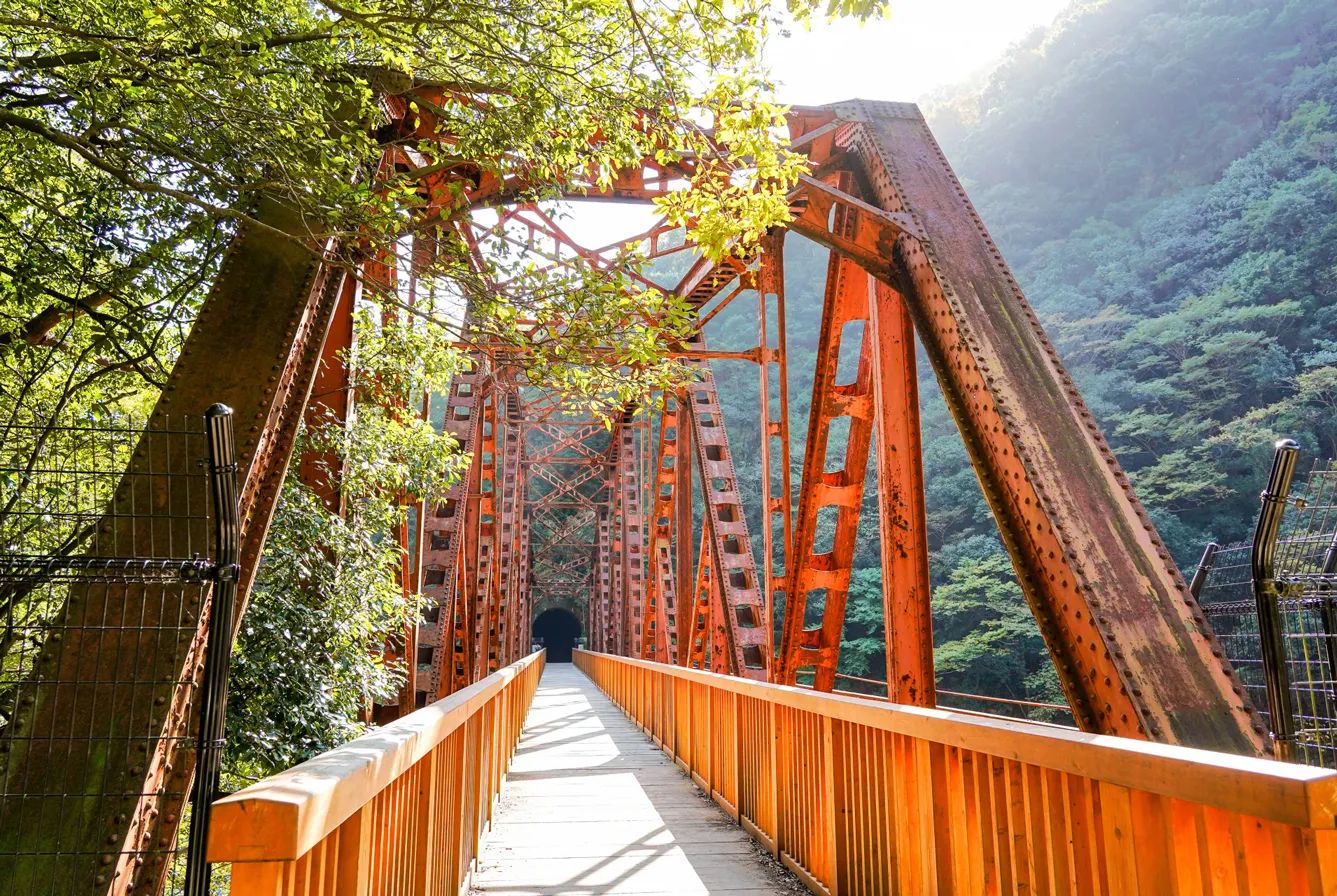 生瀬から武田尾へと続くJR福知山線廃線敷のハイキングコース。道中には、レールや橋、トンネルといった鉄道遺構が残っており、自然の恵みと人間の営みが響き合う風景を愉しむことができる。