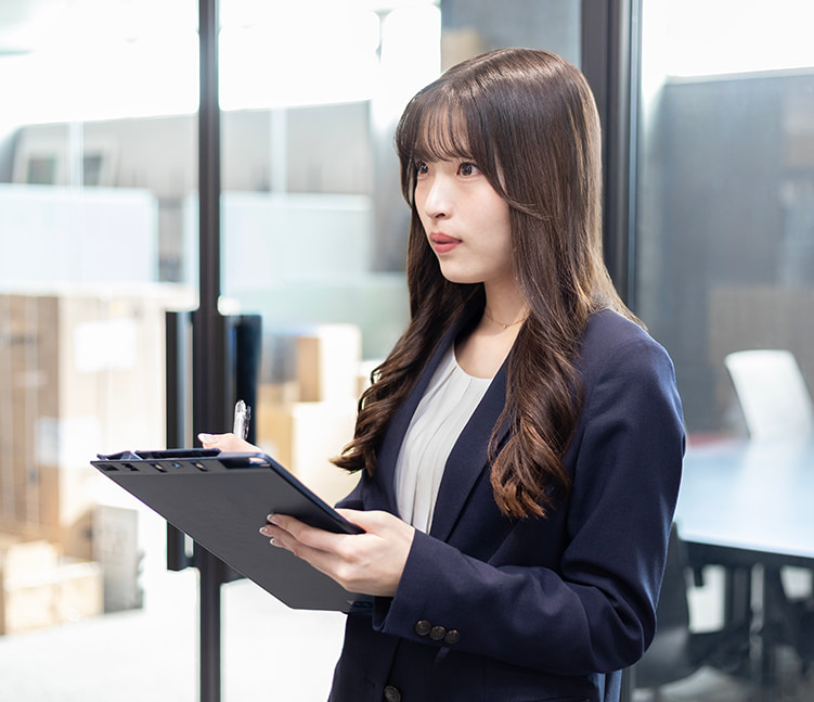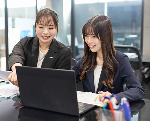 サポートする上で、「今、何が求められているのか」を常に考え、先回りして行動することを大切にしています。同時に事務作業には正確性が求められるので、ミスを防ぐための確認作業も欠かさず行うよう心がけています。営業スタッフやご来店されたお客様からいただく「ありがとう」の言葉は、支える立場として働く私にとって、大きなやりがいと励みになっています。