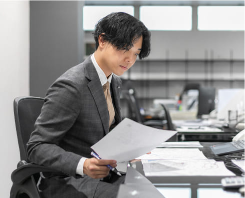 物件完成までの一連の工程において、土地開発の企画・進行管理を担当しています。解体や加工の手配、隣地対応、契約準備、物件資料の確認など、土地の開発と一言でいっても業務内容は多岐にわたります。業者様とのやり取りに付いていけるように、新卒の頃から管轄エリアの土地の特徴など、不動産知識を蓄えることを意識してきました。そうした日々の積み重ねで、今では専門的な話題にも自然に受け答えができるようになりました。