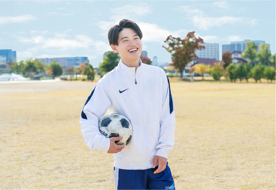 休日は社会人チームでサッカーやフットサルを楽しんでいます。留学経験もあり、指導者として高校サッカーの練習にも参加しています。