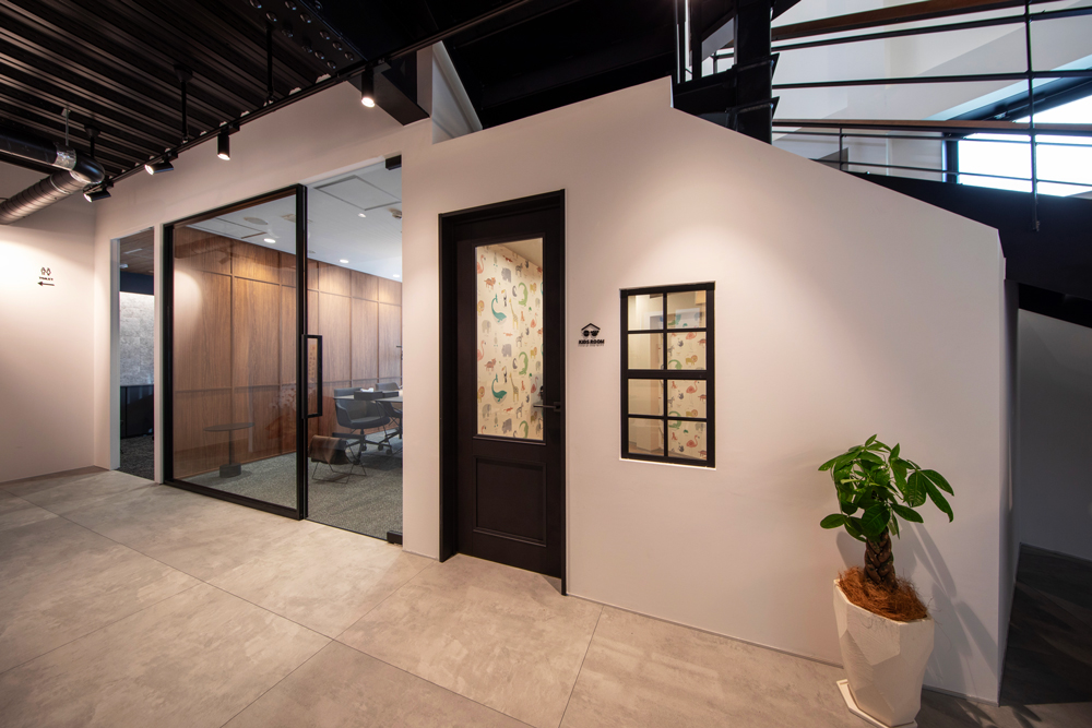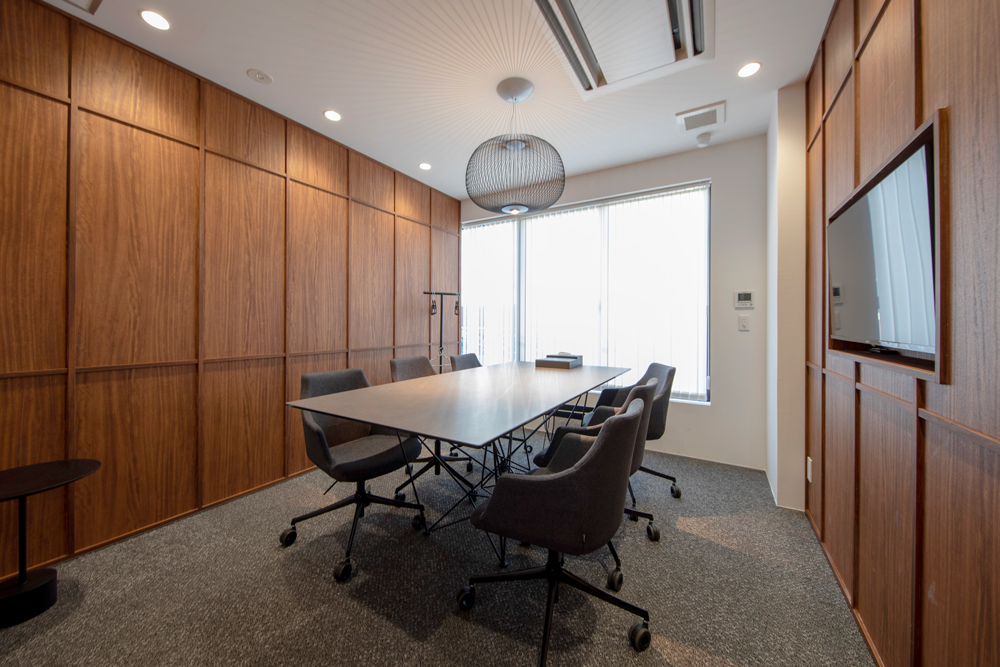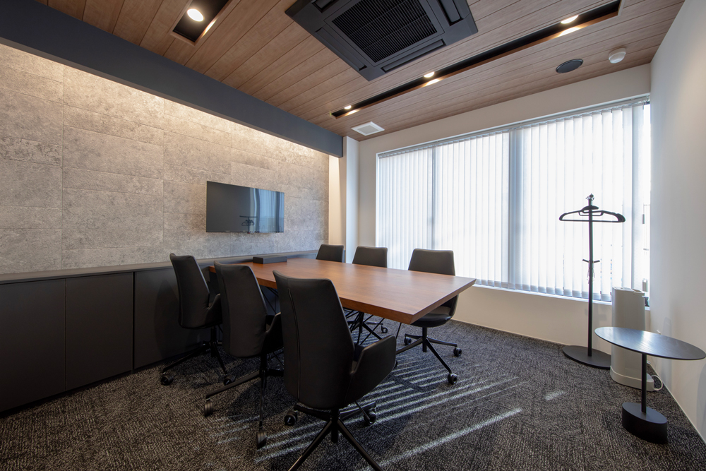 2つの個室型商談ルームは、壁に使用する素材を効果的に使い分け、印象が異なるプライベート空間に。木と石、それぞれが持つ素材感を活かし、落ち着きのあるテイストでまとめています。