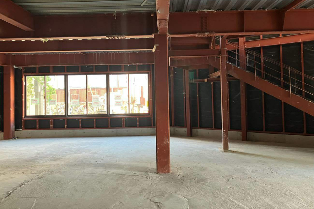 背の低い間仕切り壁で空間をゆるやかに分けた抜け感のある店内。ブラックで統一したスケルトン天井にすることで天井高を上げ、開放感を創出します。また、室内窓やガラスドアを用いることで見通しがよくなり、より広がりが感じられます。