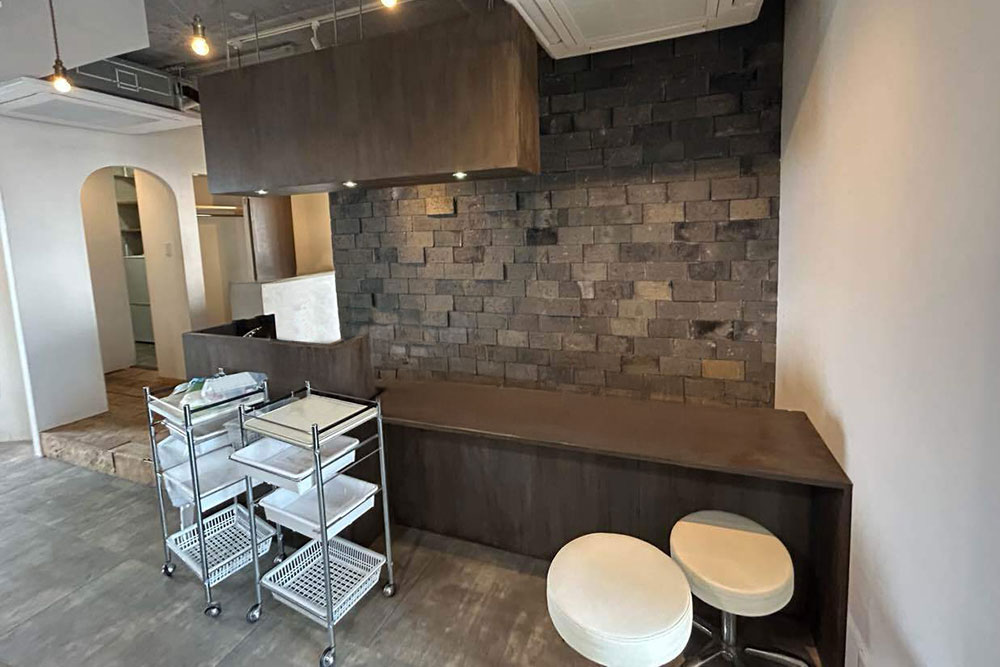 お客様をお迎えする受付カウンターや戸棚は、ダークブラウンから白に刷新。施術スペースは壁一面に広がる重厚感のある棚を取り払うことにより、視界が開けて明るく開放的なスペースを創造しました。